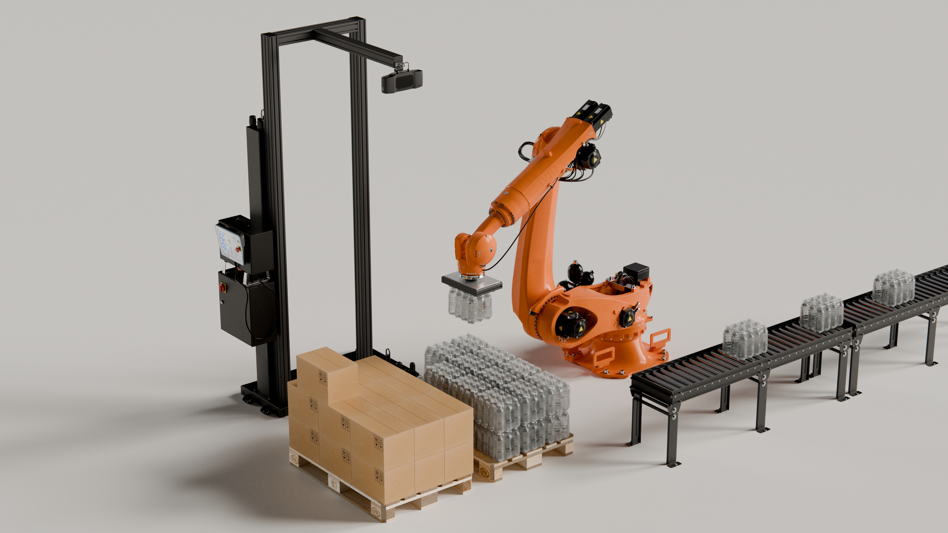 One benefit of the robot mounted scenario is that the absolute height can be adjusted as layers on the pallet is removed (or added). The camera should always be positioned such that it can see the entire top-layer, but not much more.