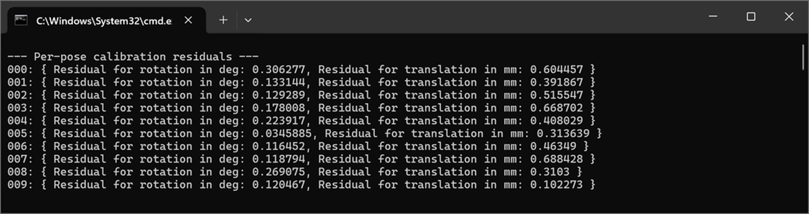Good residuals do not guarantee that the hand-eye calibration is accurate. Moreover, residuals are not a direct measure of the expected accuracy of the robot’s positioning. Therefore, it is important to verify the hand-eye calibration using other methods.