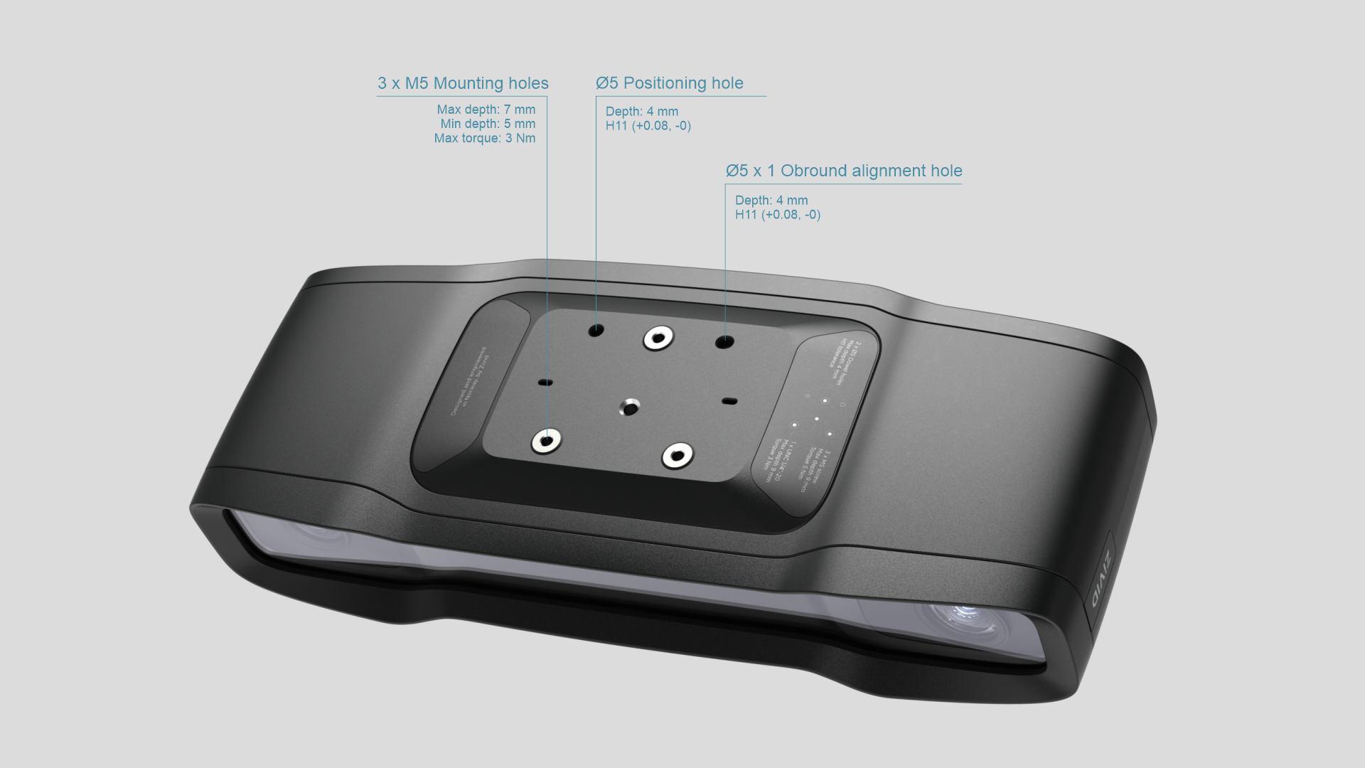 This Zivid camera has three M5 mounting holes, one Ø5 positioning hole, and one Ø5x1 obround alignment hole. We recommend using DIN 912 / ISO 4762 Hexagon or ISO 14579 Hexalobular socket head cap screws in stainless steel (A2 or A4). To ensure not damaging the threads, we recommend not exceeding the specified maximum torque value when fastening the screws.