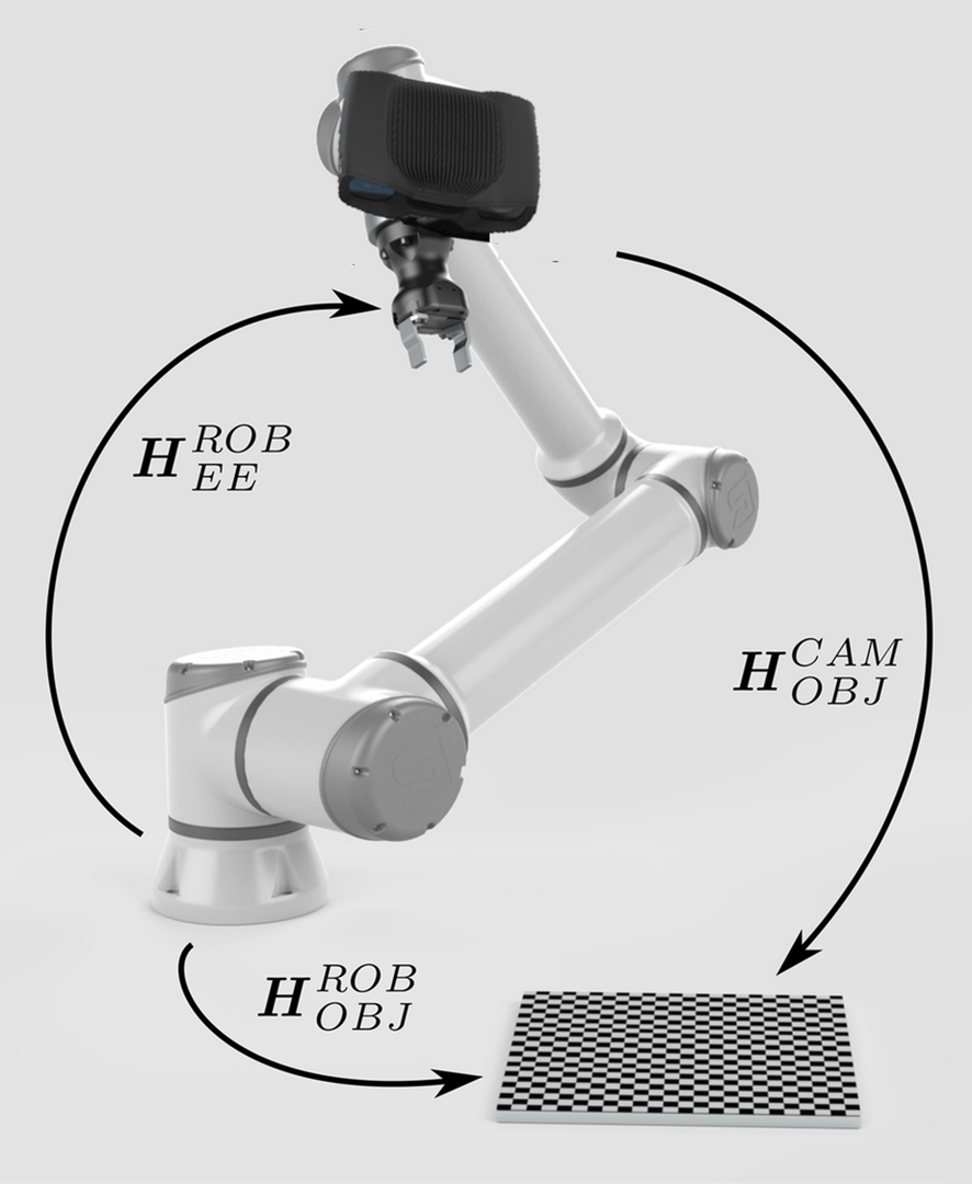 The calibration object is of known geometry. Thus, it can be detected from the camera image. Further, its pose relative to the camera (\(H^{CAM}_{OBJ}\)) can be estimated. |
