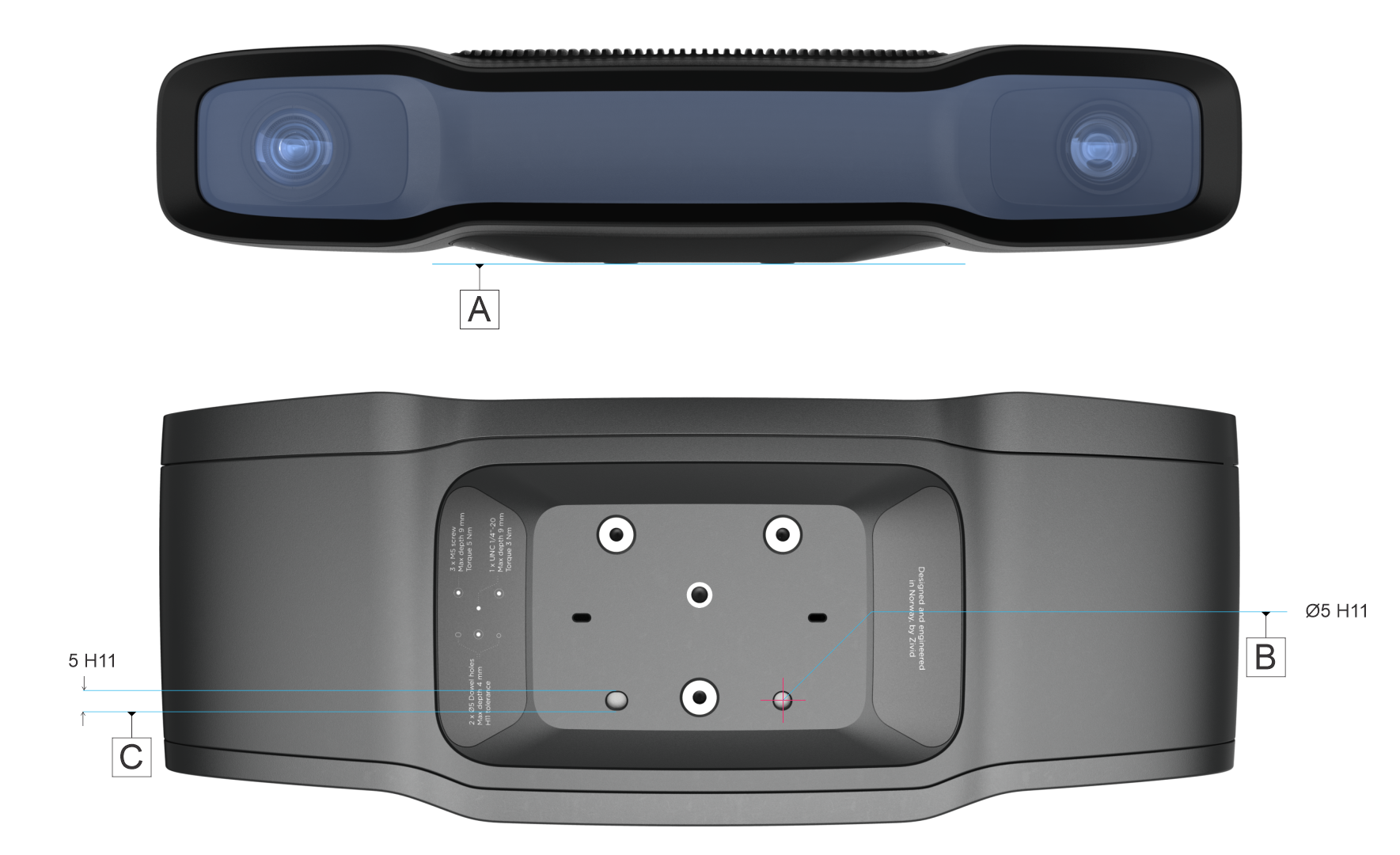 The datum reference of the Zivid 3 CAD models is at the center of the Ø5 positioning hole (B in the image below).