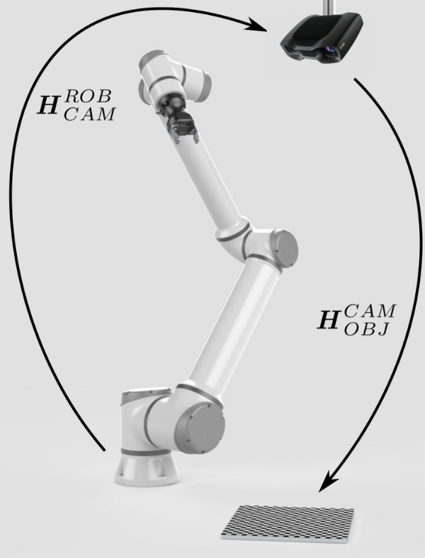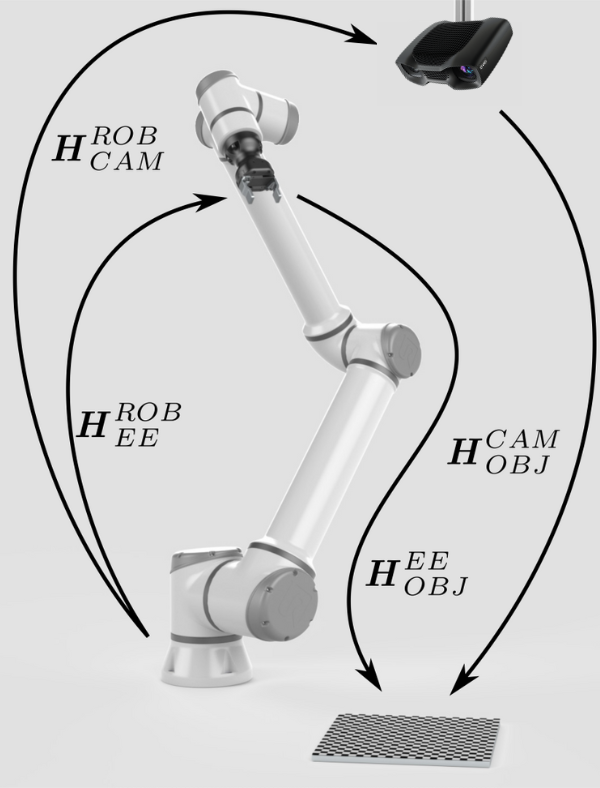 칼리브레이션 개체는 알려진 형상입니다. 따라서 카메라 이미지에서 감지할 수 있습니다. 또한 카메라를 기준으로 한 포즈(\(H^{CAM}_{OBJ}\)) 추정할 수 있다. |