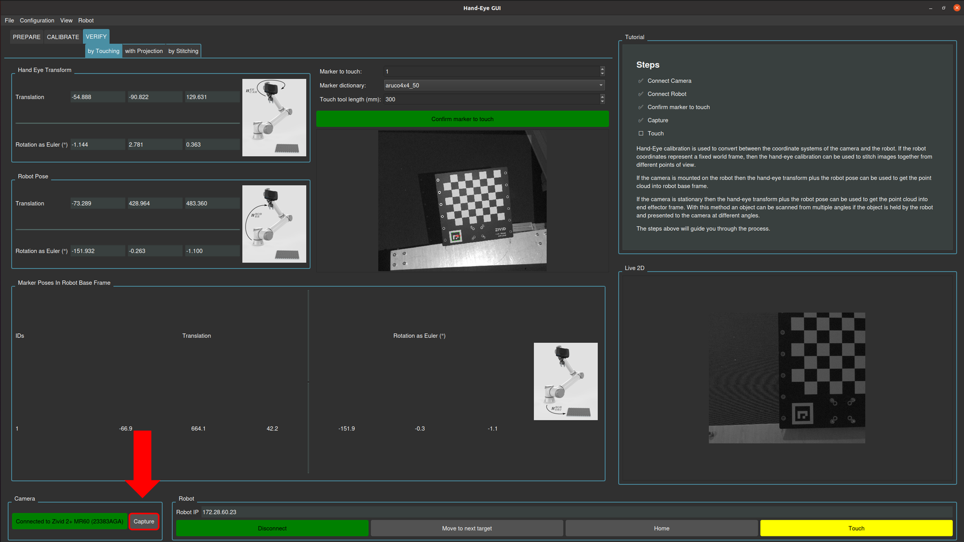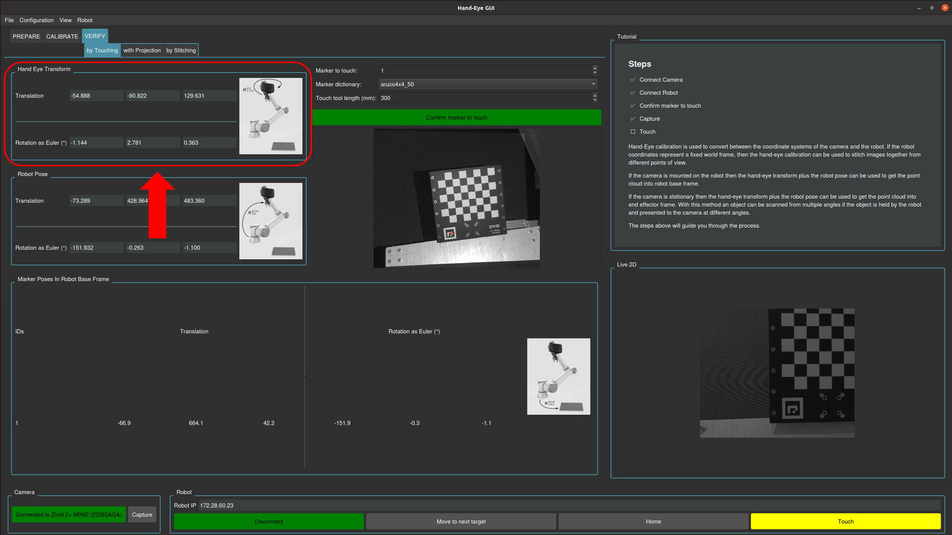 The camera captures the Zivid Calibration Object and the pose of the touching point is computed and displayed to the user.