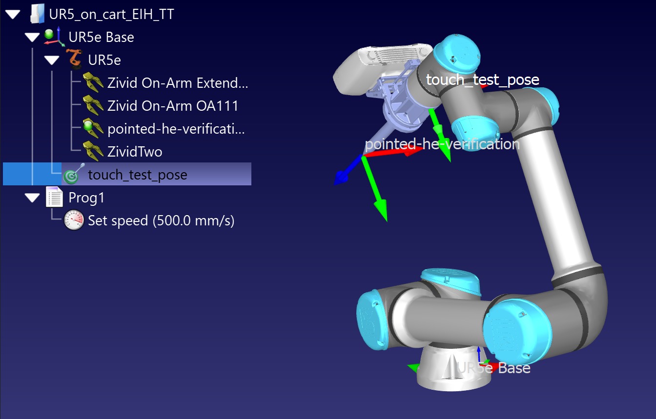 Sometimes it is hard to measure how accurate the Hand-Eye Calibration is. Therefore, we created a Touch Test to verify accuracy easily. In this test, we use RoboDK to move the robot. This sample works for the results of both types of Hand-Eye Calibration, Eye-in-Hand and Eye-to-Hand. The Touch Test consists of placing the Zivid Calibration Object in the FOV of the camera, capturing it, and controlling the robot to touch it at a specific point. After touching, you can displace the Zivid Calibration Object and instruct the robot to touch it again. You can repeat this process as many times as you want. The only two limitations are the robot’s reach and the camera’s FOV.