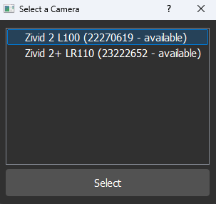 Select a camera: Choose one of the connected cameras. If a firmware upgrade is required, you will be prompted in the next step.