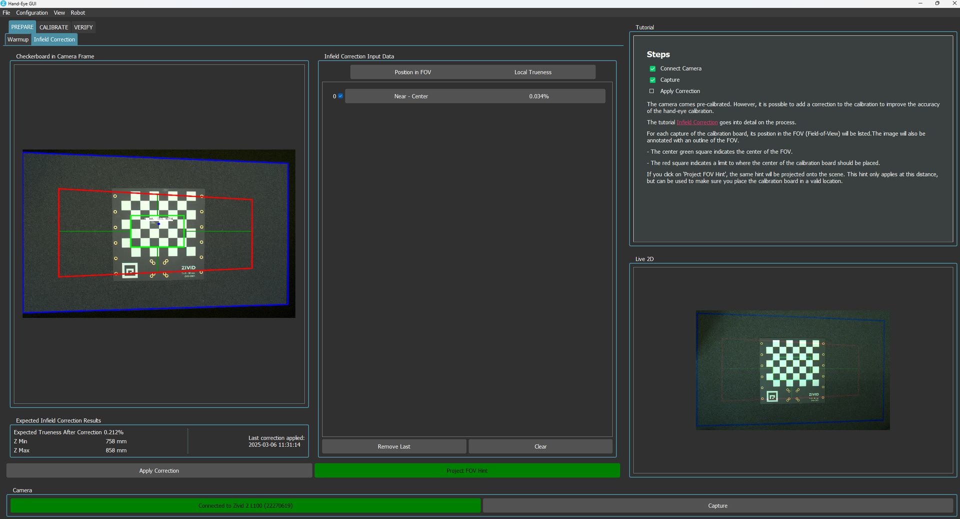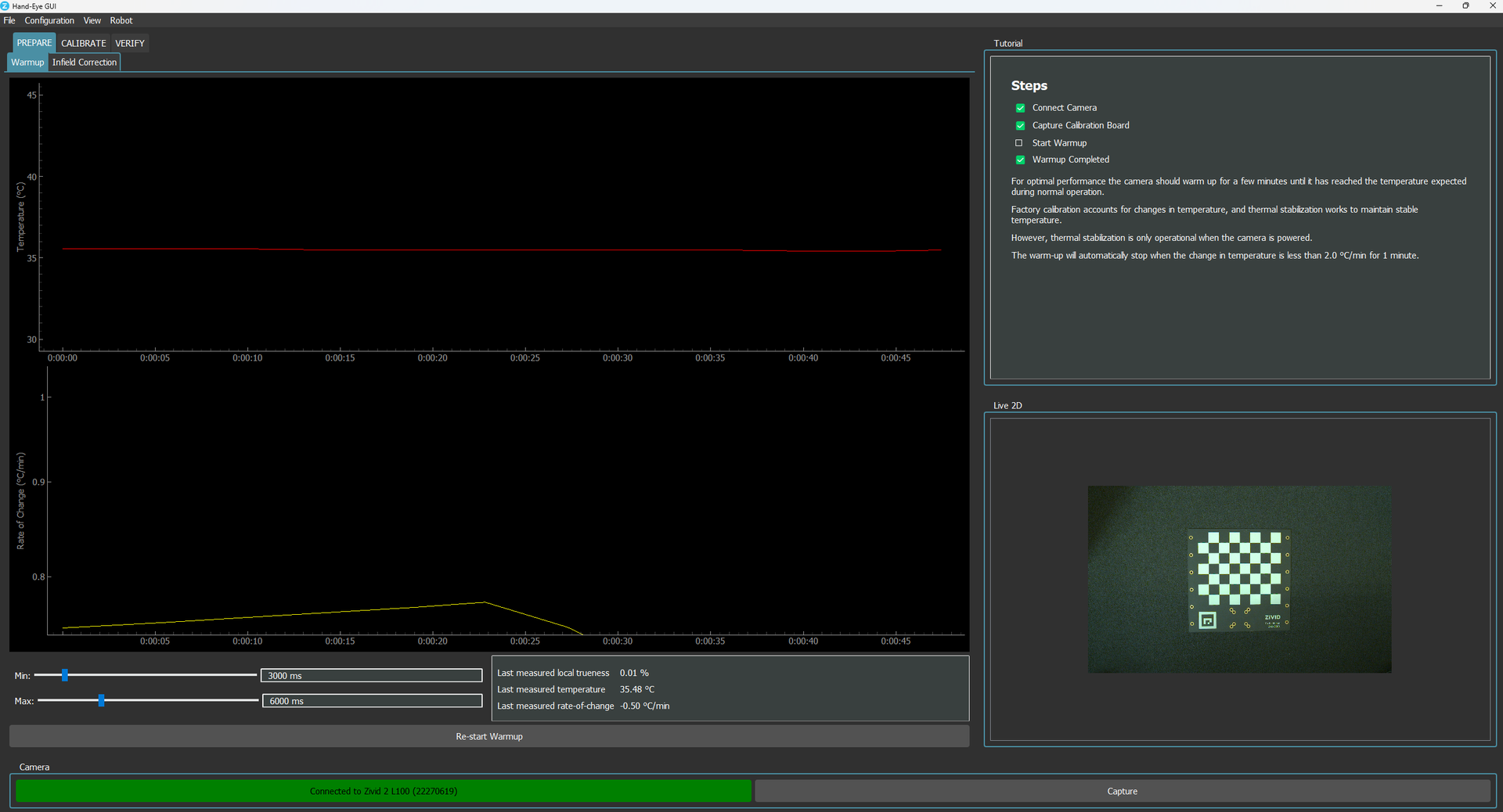 Run the Hand-Eye calibration procedure using the GUI by following the instructions in the Tutorial section (top right).