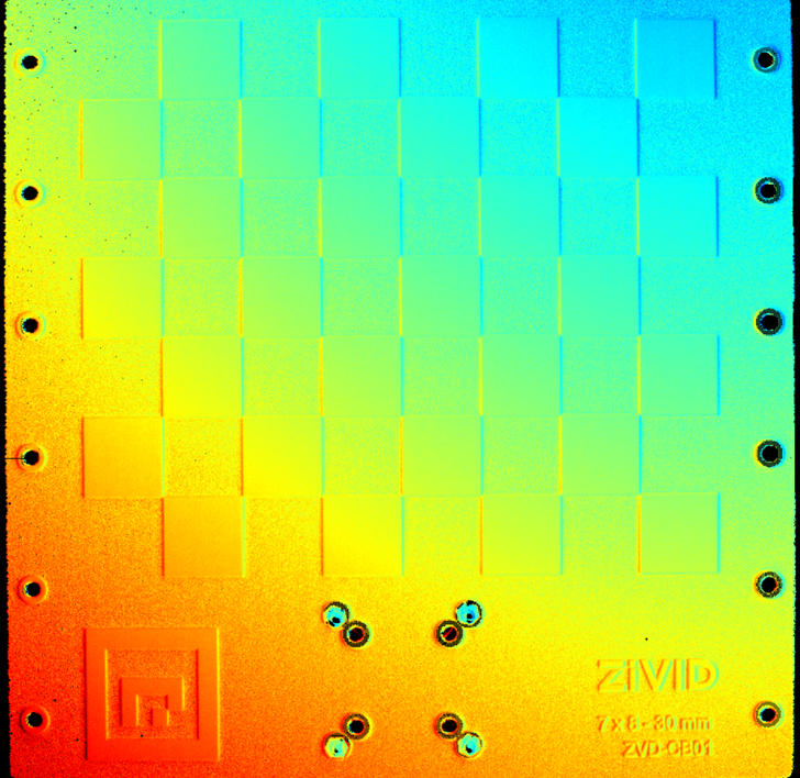 Turn off the “Acquisition 1” and clone it. This “Acquisition 2” needs to be tuned to have good data on the black part of your calibration object. Therefore, it’s expected to overexpose the white regions. Look at the following image as an example, where we have no data on the white part of the checkerboard due to overexposed white pixels: