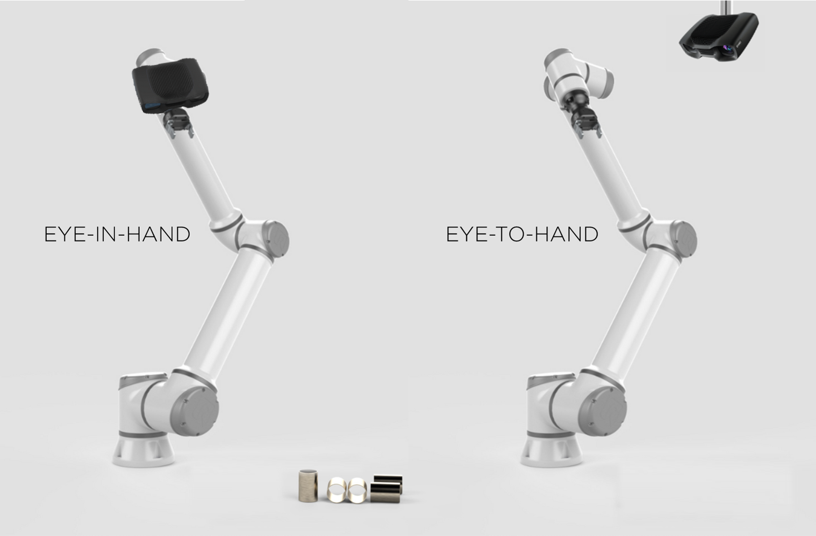 비전 가이드 로봇 시스템에서 카메라의 위치와 관련하여 “Eye-to-hand” 와 “Eye-in-hand” 의 두 가지 고유한 표준 구성이 있습니다.