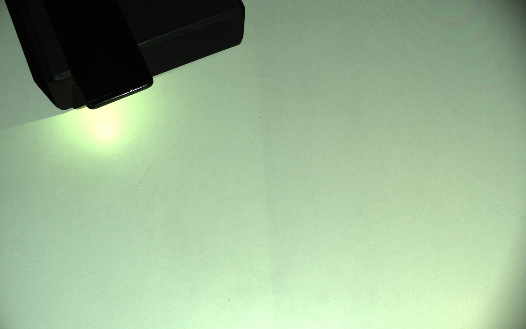 In front of the camera, we placed a smartphone with the flashlight turned on. Then, we captured an image with the projector on and set it to maximum (brightness = 2.5 for Zivid 2+ and 1.8 for Zivid 2). The remaining exposure settings we configured accordingly to get a high-intensity image while avoiding oversaturation as much as possible. The resulting image shows that the flashlight seems to be the only source of light in the scene other than the projector.