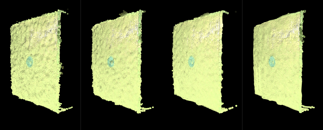 아래 이미지는 이 HDR 기술을 적용한 효과를 보여줍니다. 가장 왼쪽의 포인트 클라우드는 단일 획득으로 캡처됩니다. 두 번째 포인트 클라우드는 2-acquisition HDR로 캡처됩니다. 세 번째는 5개 Acquisition HDR로 캡처됩니다. 가장 오른쪽 포인트 클라우드는 8개 Acquisition HDR로 캡처됩니다.