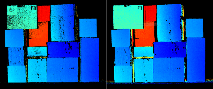아래 이미지는 약 4.5m의 동일한 장면에서 두 개의 다른 outlier 임계값을 사용하여 찍은 두 점 구름의 깊이 맵을 보여줍니다. 왼쪽 이미지는 25mm와 75mm 오른쪽의 outlier 임계값을 사용합니다. 특히 왼쪽 상단 상자에서 볼 수 있듯이 25mm의 outlier 임계값을 사용하면 성긴 점 구름이 생성됩니다.