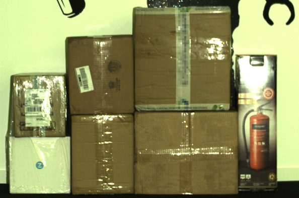 대략 \(1200 \times 1200 \text{ mm}^2\) 의 영역에 물체각 있습니다. 광택 마감 처리된 흑백 상자, 일반 판지 상자, 플라스틱 호일로 포장된 상자, 로고가 있는 상자 및 테이프가 있는 상자 등의 혼합 상자로 구성됩니다. 이 예에서 카메라는 대략 개체의 중심과 정렬되도록 배치됩니다. 그러나 항상 Zivid 카메라를 비스듬히 기울이는 것이 좋습니다. 이는 직접 반사 및 관련 아티팩트를 방지하고 수집에 필요한 동적 범위(Dynamic Range)를 줄이는 데 도움이 됩니다. camera positioning 에 대한 일반 권장 사항을 참조하십시오.