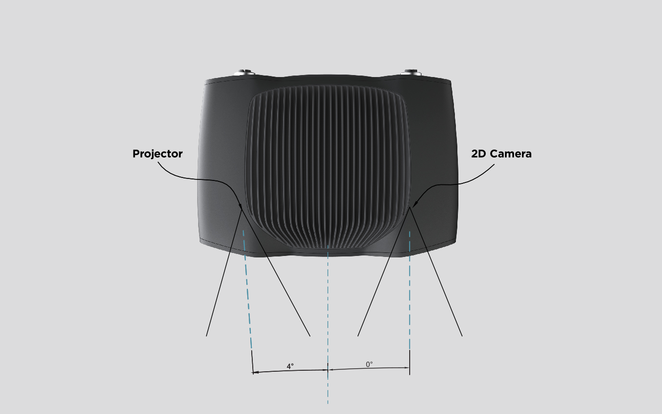 The 2D camera and the projector have an angle with respect to the center axis. This should be considered if it is desired to have the camera perpendicular to the scene.
