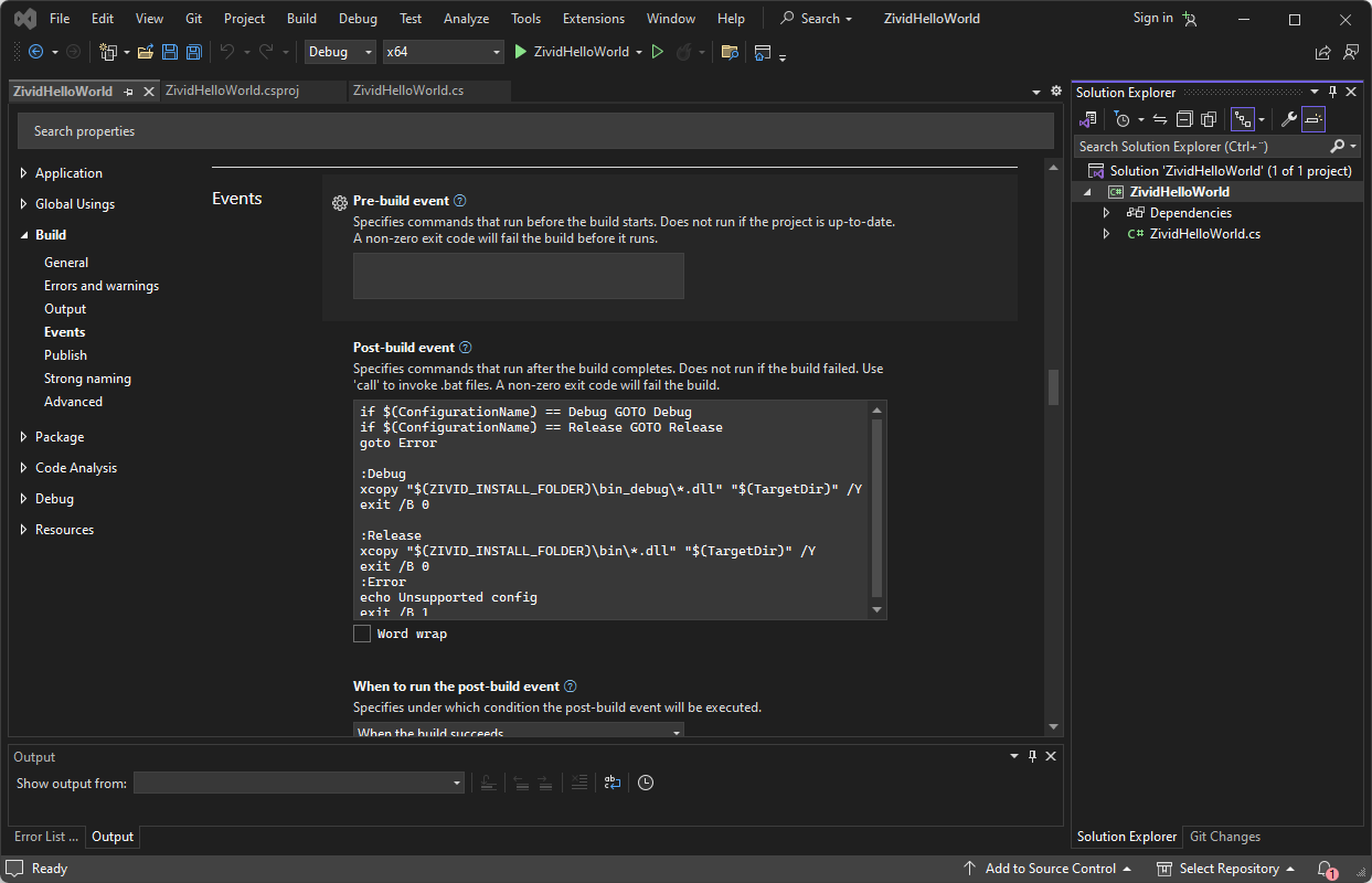 In the same Build page, under Events, add the following code block to the Post-build event event command line:
