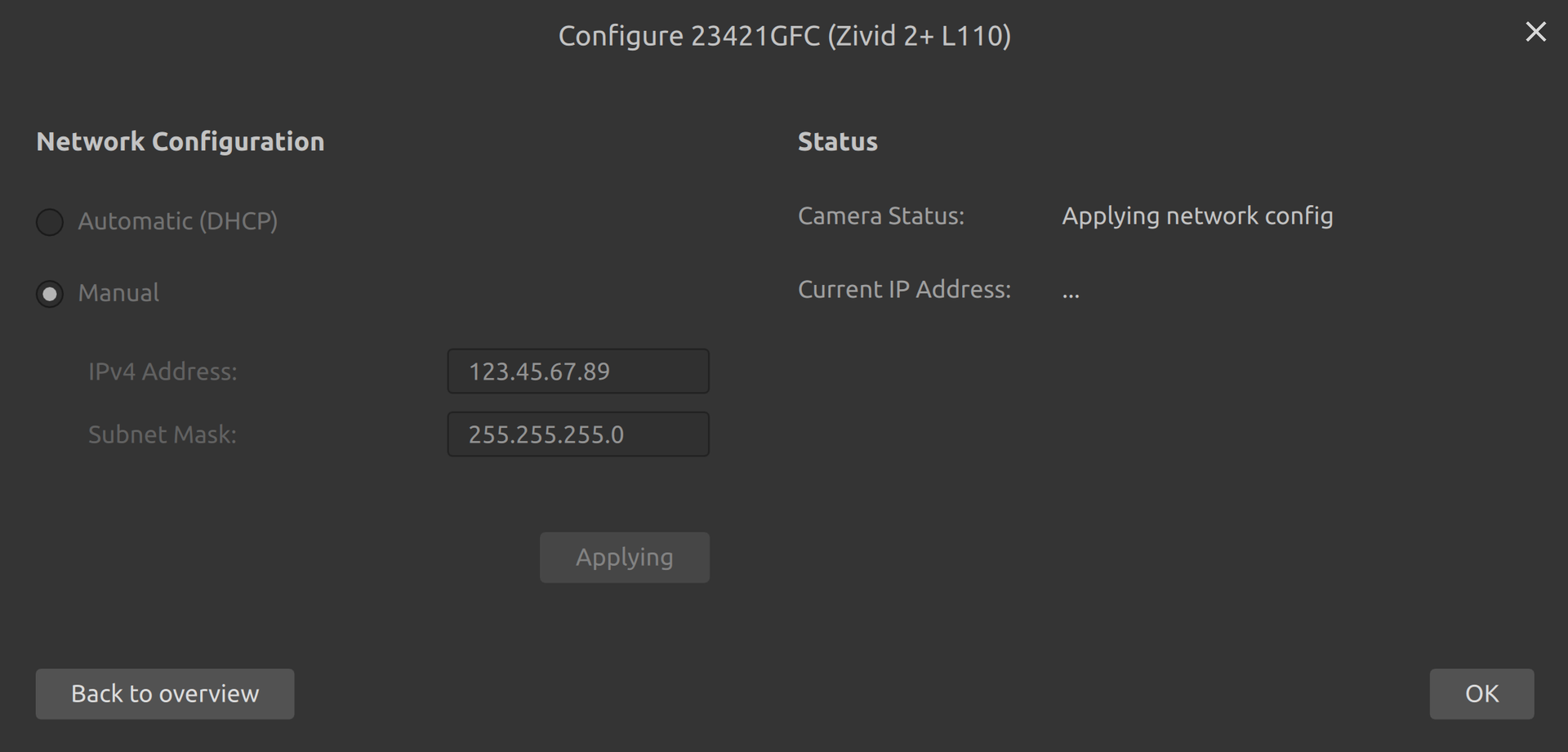 <host>in static IP mode with a specific IP address<ip>, subnet mask<mask>and gatewaygateway. Make sure the IP address is not colliding with anything else on your network.ZividNetworkCameraConfigurator.exe set-config <host> --static --ip <ip> --subnet-mask <mask> --gateway <gateway>