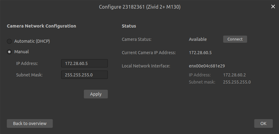 Select the manual network configuration mode, and enter your desired IP address and subnet mask. Make sure the IP address is not colliding with anything else on your network. Click Apply to apply the configuration to the camera.