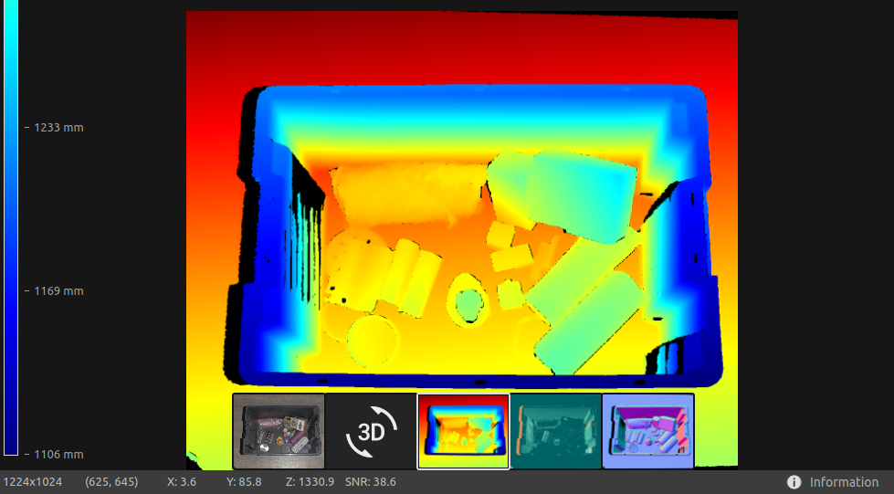 색상 스케일은 카메라에서 이미지화된 객체 표면까지의 z축을 따라 거리 변화를 나타냅니다. z축을 따라 범위를 수정하려면 왼쪽 위 드롭다운에서 고정된 Z 범위를 사용하여 색상 스케일을 좁힐 수 있습니다.