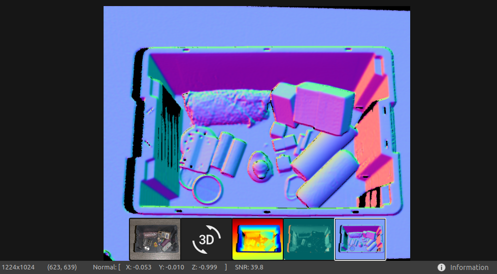 변환을 포인트 클라우드에 적용하여, 모든 포인트를 카메라 좌표계에서 원하는 좌표계로 변환할 수 있습니다. 이는 다양한 컬러 모드와 함께 사용하여 포인트 클라우드를 검사할 때 유용할 수 있습니다. 변환은 파일에서 불러오거나 관심 영역(Region Of Interest)을 통해 설정할 수 있습니다. 이 설정은 Depth 및 Normals 뷰에도 영향을 미치는데, 이는 현재 좌표계를 기준으로 하기 때문입니다.