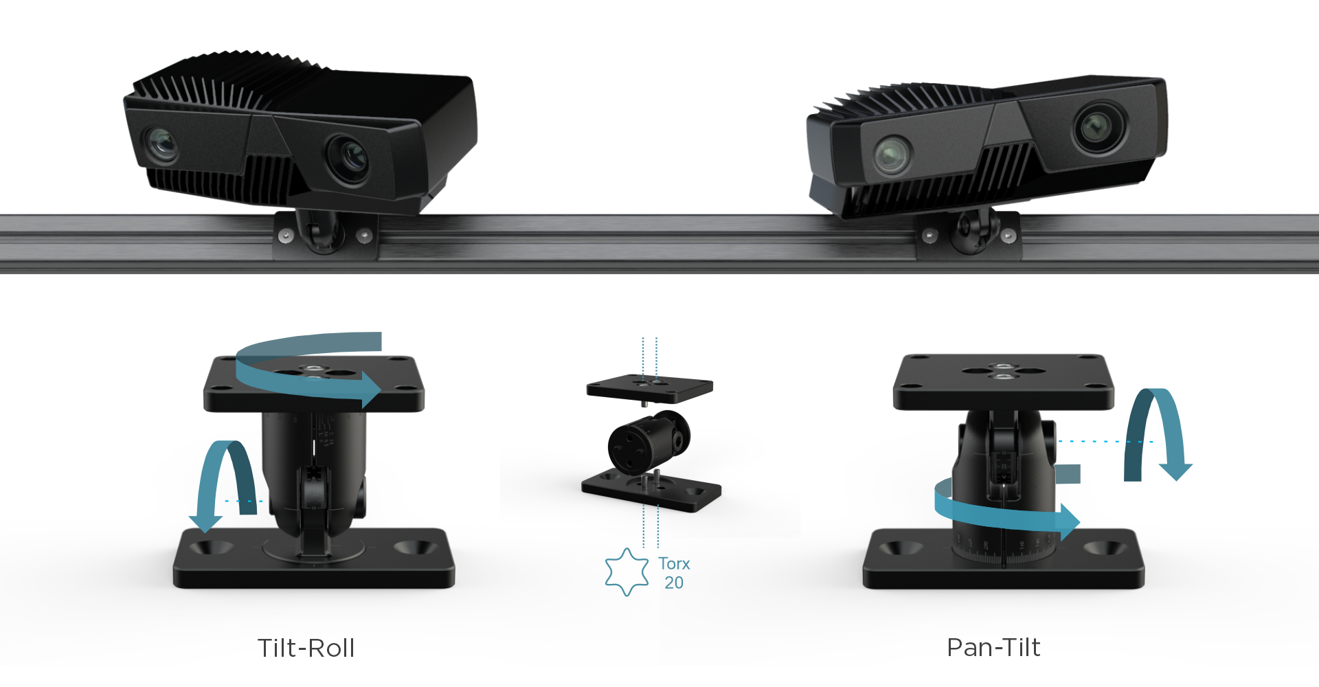 마운트는 pan-tilt 또는 tilt-roll로 재구성할 수 있습니다. 마운트를 설치하기 전에 애플리케이션에 가장 적합한 구성을 평가하십시오.