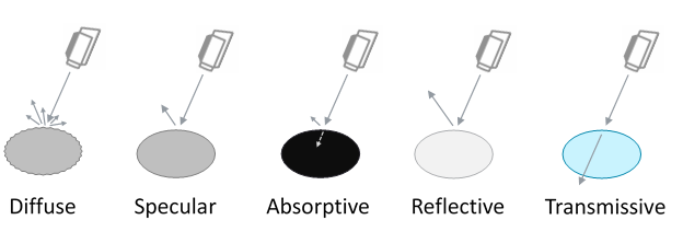 아래 이미지는 위에서 설명한 재료의 다양한 광학 특성에 대한 개요를 보여줍니다. 왼쪽의 두 그림은 서로 다른 반사율 수준을 보여 주는 반면 왼쪽의 그림 3과 4는 다른 흡수 수준을 보여줍니다. 가장 오른쪽 그림은 투과율을 보여줍니다.