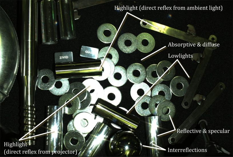 재료의 이러한 광학적 특성의 합은 재료를 보는 것이 얼마나 쉽거나 어려운지, 따라서 3D 스캐너에 얼마나 적용 가능한지를 결정합니다. 반사율, 흡수율, 투과율이 낮은 물체와 장면은 대부분의 광학 기기에 적합합니다. 세 가지 속성 중 어느 하나의 정도를 높이는 것이 근본적인 과제입니다. 오늘날 많은 3D 스캐너는 일반적으로 투명하고 반짝이는 물체라고 하는 것에 만족스러운 결과를 생성하기 위해 고군분투하고 있습니다. 아래 그림은 반사, 반사 및 흡수 재료를 모두 포함하는 도전적인 장면의 예를 보여줍니다.