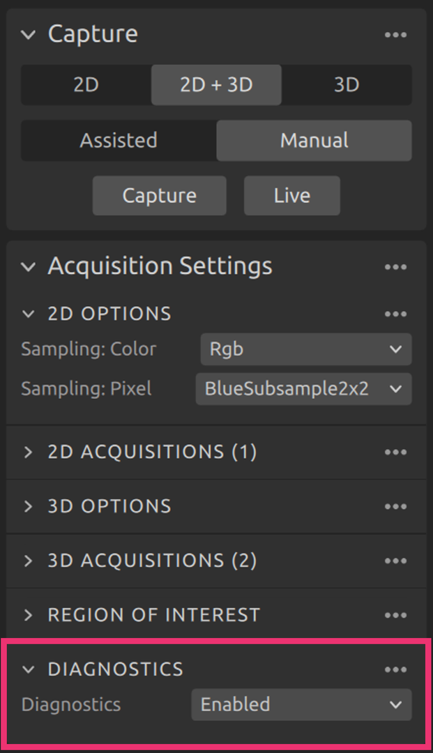 문제가 포인트 클라우드 또는 컬러 이미지의 아티팩트와 관련된 경우 .zdf 파일을 제공하면 큰 도움이 됩니다. Zivid 지원의 효율성을 극대화하려면 캡처하기 전에 Diagnostics 를 활성화하여 .zdf 파일을 저장함으로써 추가 데이터를 수집하십시오.
