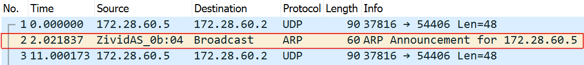 From SDK 2.11, the Zivid SDK detects all Zivid cameras on the network and reports their status. If you are unable to upgrade to SDK 2.11, you can use a network analyzer to find the IP address. The following steps uses Wireshark as an example.