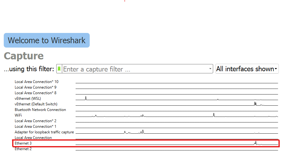 Wireshark 열고 카메라에 연결된 네트워크 인터페이스를 선택합니다. (예: 이 예에서는 Ethernet 3)