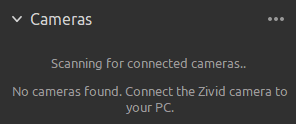 Scan for the connected cameras by pressing … followed by Scan for connected cameras, or restart Zivid Studio.