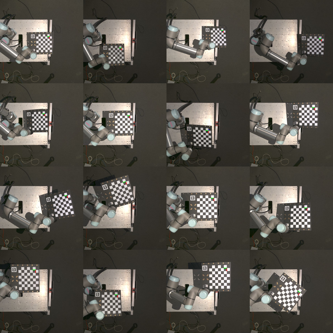 The same dataset was used for hand-eye calibration. However, the acceleration of the robot was intentionally increased to simulate a vibrating calibration board during the dataset acquisition. The delay after the robot reached its target pose before capturing was also intentionally shortened to further simulate the effect of a vibrating calibration board.