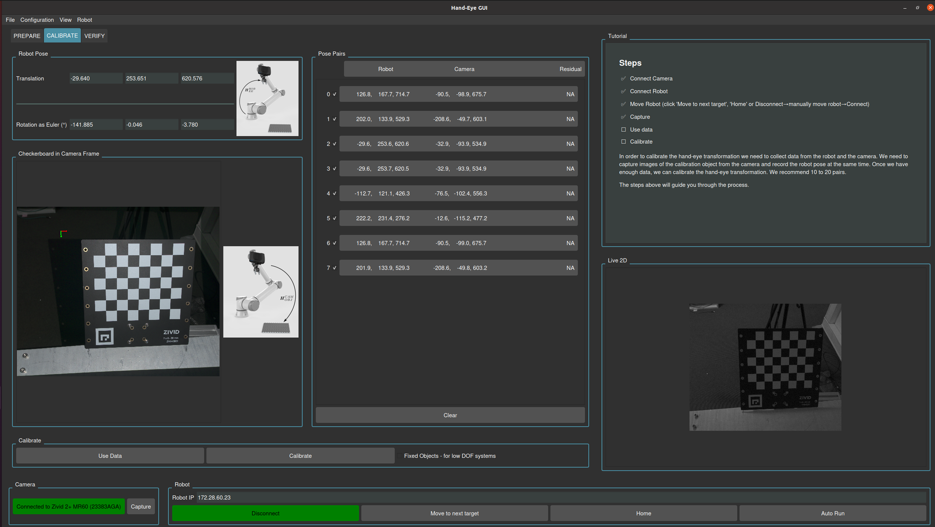 按照教程部分(右上角)中的说明,使用 GUI 运行手眼标定程序。