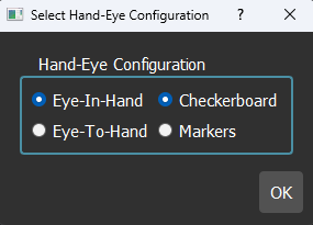 3. Select the setup type: Choose the Hand-Eye calibration type based on your system configurations and the 标定对象 you will use.