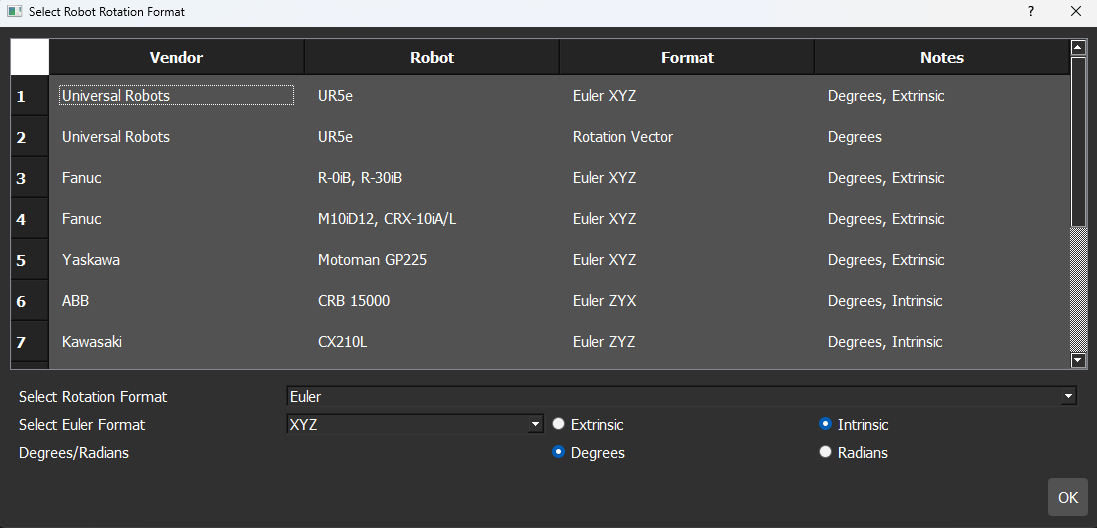 选择旋转表示格式:选择与您的机器人匹配的旋转格式和单位。您可以从列表中选择机器人,也可以手动配置设置。下表列出了一些常用的机器人,但所有格式均受支持。