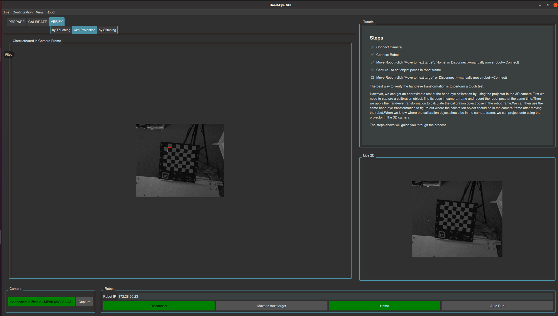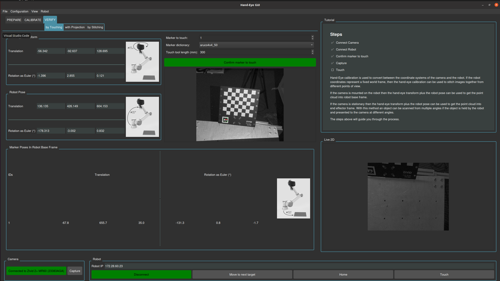 进行手眼标定后,必须验证相机和机器人坐标系之间转换关系的准确性。GUI 有几种互补的方法来确保手眼标定的精确性和可靠性: