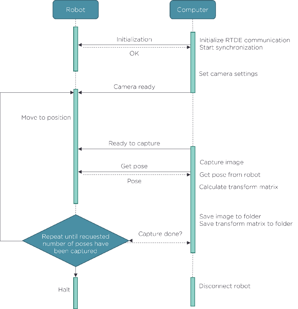 机器人运动脚本是我们设置标定中使用的所有机器人位姿的地方。python脚本用于捕获图像,读取机器人位姿并执行手眼标定。 机器人与计算机之间的通信通过UR RTDE (Real-Time Data Exchange) 协议完成。通信流程如下图所示。