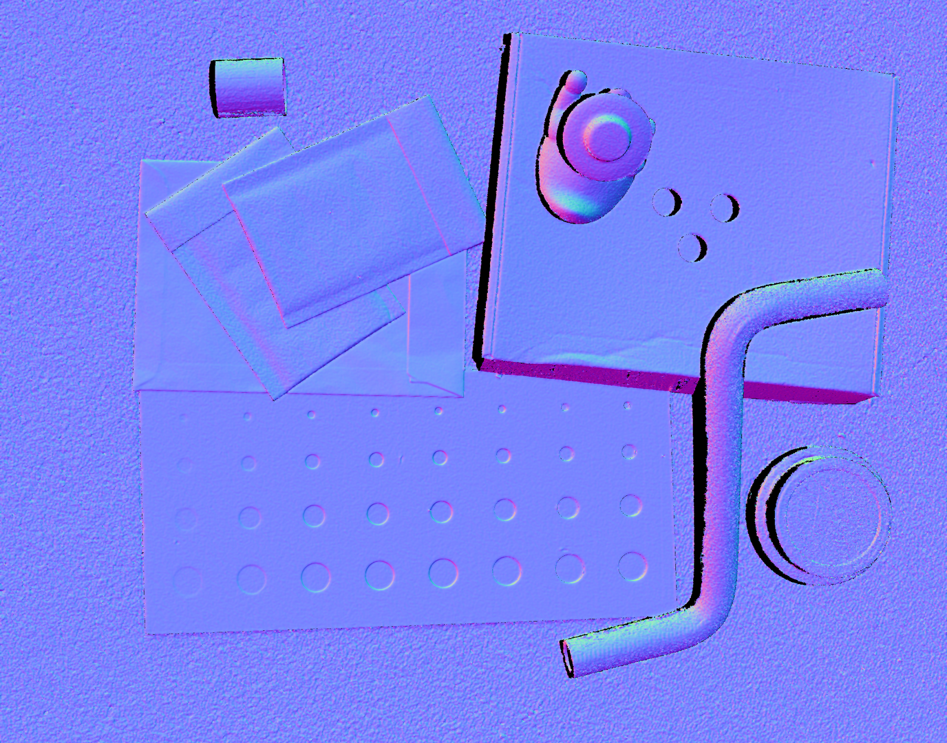法线图提供了场景表面法线的 2D 表示,其中 RGB 颜色分量描述法线向量。下图中的箱壁和底板很好地显示了法线图中法线向量与颜色分量之间的关系。这是因为每个表面上的所有点的法线向量都或多或少指向同一方向。