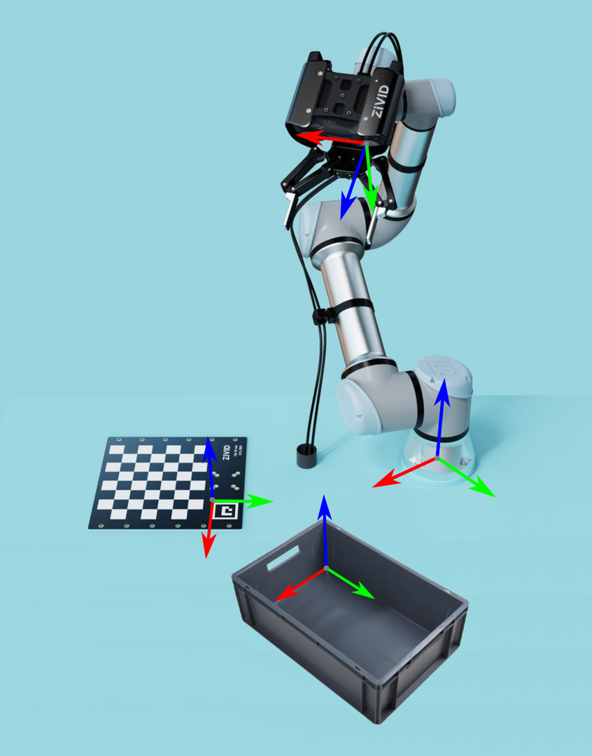 本节将介绍使用点云转换功能的Zivid相机和机器人的应用。这里说明了这些应用中的典型坐标系以及为什么要将点云转换到这些坐标系里。