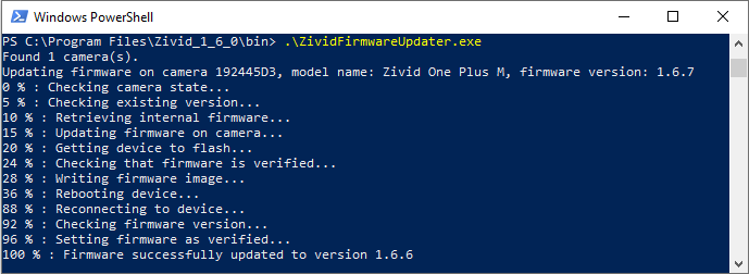 可以通过命令行界面工具 ZividFirmwareUpdater 手动更新相机上的固件。执行后,该工具将: