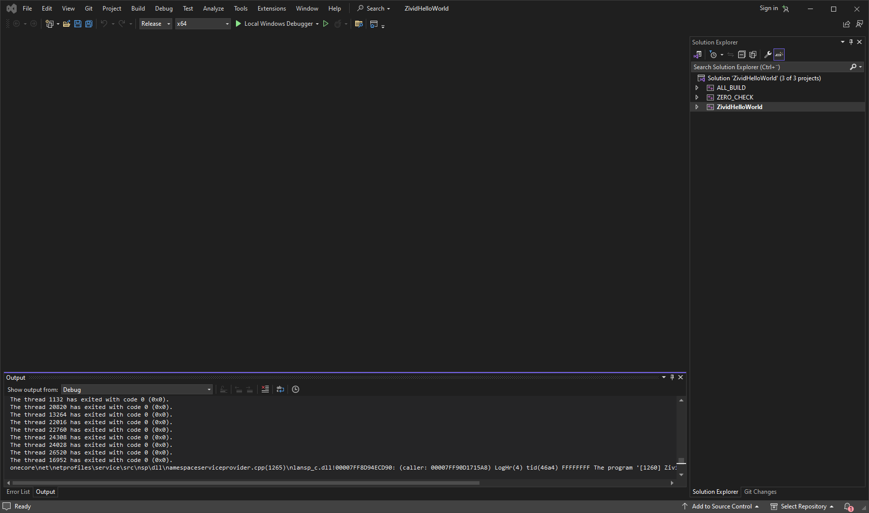 在右侧,右键单击 ZividHelloWorld ,然后单击 Set as StartUp project 。按 F5 键运行该程序。