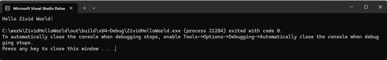 示例程序位于 ZividHelloWorld/build/Release 下的 build 目录中。您也可以通过双击文件资源管理器中的 exe 或使用命令提示符来运行示例,例如,
