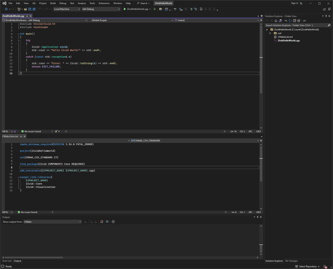 其次,将以下代码复制并粘贴到 ZividHelloWorld.cpp 和 CMakeLists.txt ;