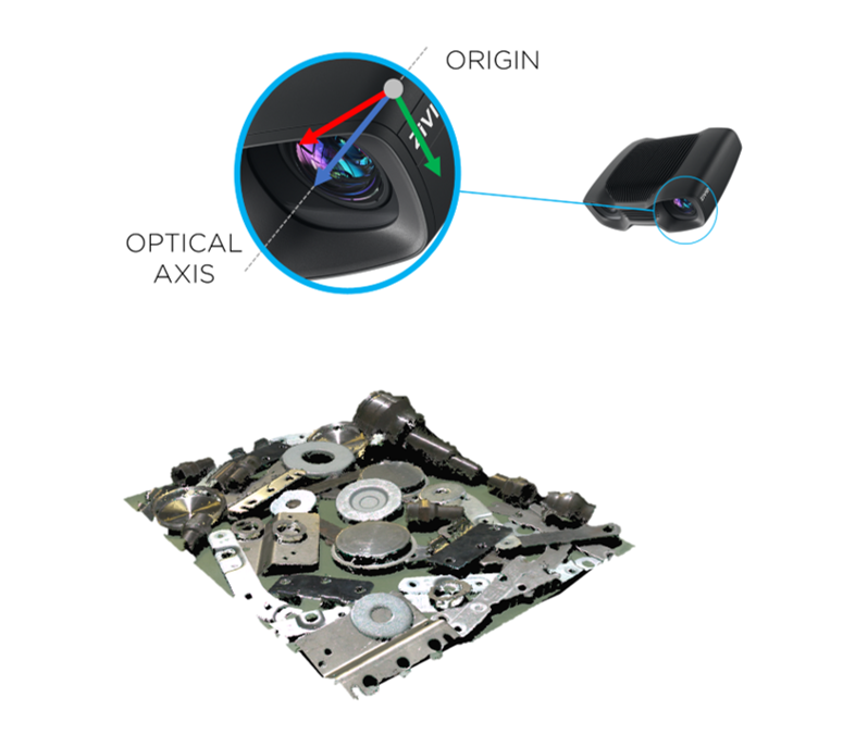 Zivid点云是相对于Zivid相机右手坐标系给出的。该坐标系的原点位于Zivid成像器镜头(内部2D相机)的光学中心。 x轴指向投影仪的右方,y轴指向下方,z轴指向外侧。