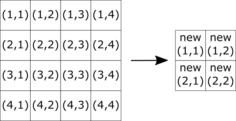 为了保证数据质量,您应该考虑所有像素并在均匀像素网格(2x2、4x4、6x6 等)上执行下采样。以下是将图像尺寸缩小一半的推荐方法,例如从 4x4 缩小到 2x2。