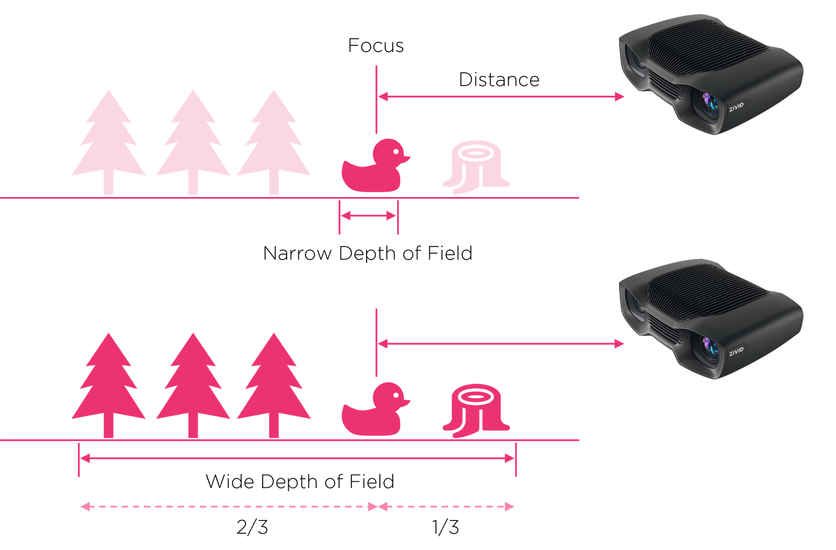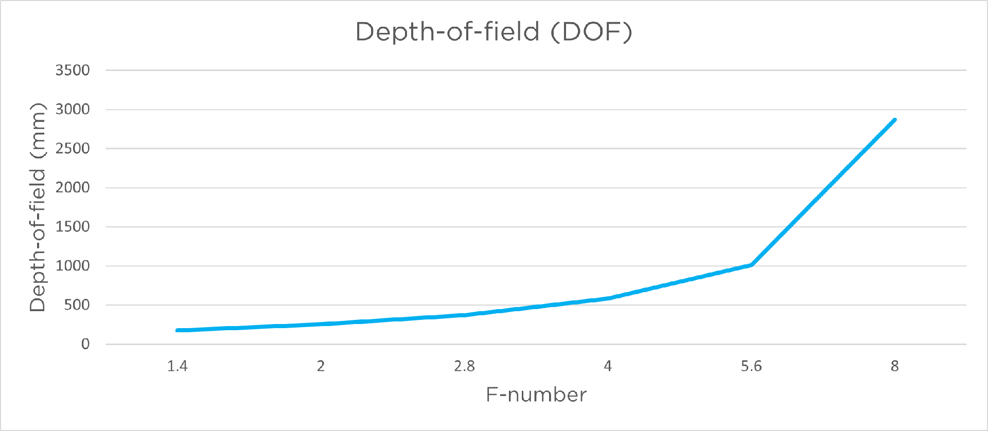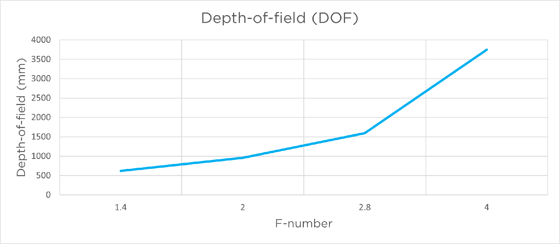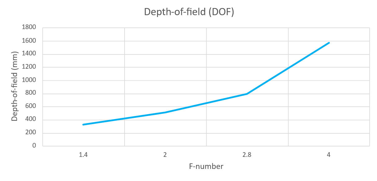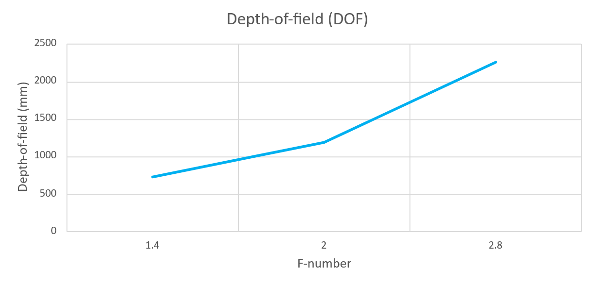 下图显示了Zivid相机的景深与光圈的关系。