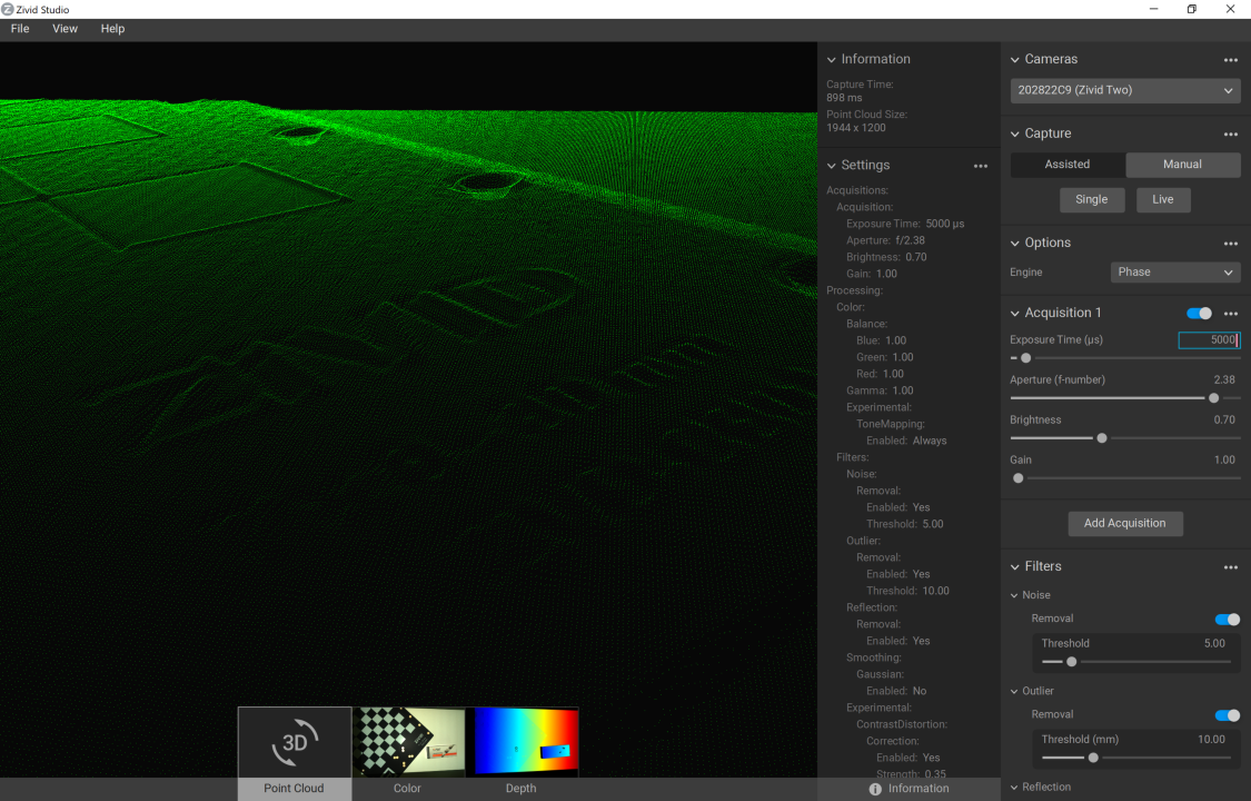 将光圈从 2.0 改为 8.0,以消除对比度失真伪影,并通过延长曝光时间来补偿此变化。结果是彩色图像清晰对焦,点云没有任何对比度失真伪影,如下图所示。