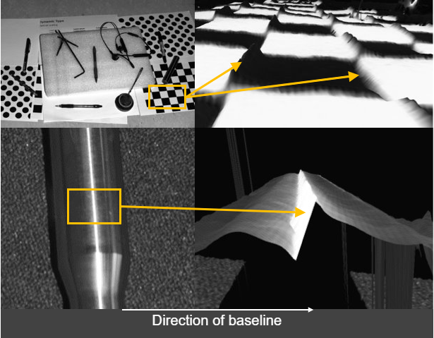 首先要记住的是,这是发生在 3D 传感器 x 轴上的影响。如果您的应用允许将相机 y 轴上的麻烦区域旋转到 x 轴,则可以大大减轻对比度失真现象。例如,通过将一个闪亮的圆柱体旋转 90°,圆柱体上的过度曝光区域将跟随相机的基线,如下图所示。