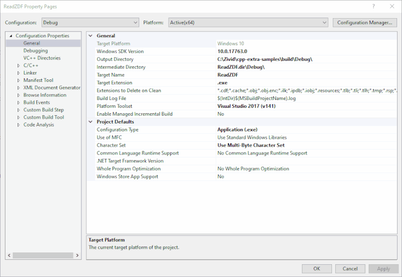 当您使用Visual Studio调试示例时,请注意Visual Studio默认会从 ${ProjectDir} 执行。因此,示例将无法找到输入文件(预期的路径为 ${TargetDir} )。