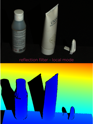 如果场景中有反射对象,请使用SDK 2.7中提供的反射过滤器的Local Mode。如果您的场景不是反射式的,或者如果您无法将SDK升级到2.7版,请关闭反射过滤器。另一种选择是旋转对象或相机,使对象在彩色图像中显示为水平。