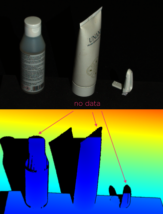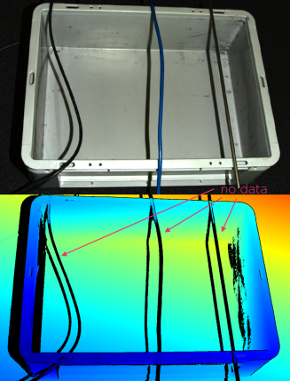 对细的物体进行成像可能具有挑战性。在某些情况下,表征它们的数据可能会在点云中丢失。仅当细的对象在彩色图像中垂直对齐并且它们与后方的表面之间的z轴距离较大时才会发生这种情况。垂直对齐的尖锐的对象也会出现同样的问题。