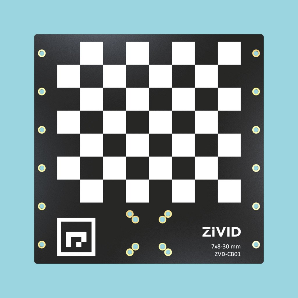 Zivid使用棋盘格进行手眼标定。主要的Zivid 标定对象可在 Zivid WebShop 中找到。这些标定板还可用于通过 现场标定 对相机进行维护。每张标定板都有一个7x8的棋盘格图案,由30毫米的棋盘格组成,在角落处有一个基准标记。若将这些标定板用于手眼标定,必须保证棋盘格图案和基准标记都能在每次拍照中检测到。